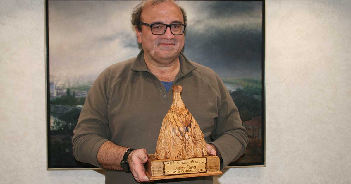 Después de la charla, el premiado junto a socios y simpatizantes compartieron mesa en un popular restaurante de la capital ribera. Durante la cena se hizo entrega del Premio de Medio Ambiente a Turiel, consistente como es tradiconal en una bella talla de madera de olivo del Castildetierra bardenero. Como es habitual y durante los postres se eligió entre tres candidatos y por votación de los asistentes el Premio Chandrío, que señala a la acción más dañina y perjudicial cometida el año pasado contra el Medio Ambiente. Este año, aunque los tres candidatos tenían méritos suficientes, el triste galardón fue para todas las empresas que han generado una avalancha de proyectos de grandes polígonos eólicos y solares en Navarra. Empresas como ENERFIN, filial eólica de Grupo Elecnor, AGROWIND NAVARRA, Forestalia, MTorres, Desarrollos Renovables del Norte, Green Capital Power, EDP, Jorge Energy, Desarrollo Empresarial Traxman, Mes Solar XVII, Enel Green Power, Global Solar Energy Ocho, Solar Fotovoltaica Navarra, Iberenova Promociones, Aixeindar, Abeto New Energy, Solaria, Aasmeel Tejeria, Solen Energía La Nava, PLANTA SOLAR OPDE 40, S.L. ALERION SPAIN, Buganvilla Solar PV, Green Capital Development 74, Generadora Eléctrica Green II, Rigel 860 Energías, Metka EGN, SACYR, Saresun, NATURGY, Falck Renewables, Río Ebro Renovables, Eólica Cascante, Solen Energía Navarra, Eólica La Torre, S. L. U. Mes Solar XVII, Renovables del Cierzo o Eólica Montes de Cierzo.