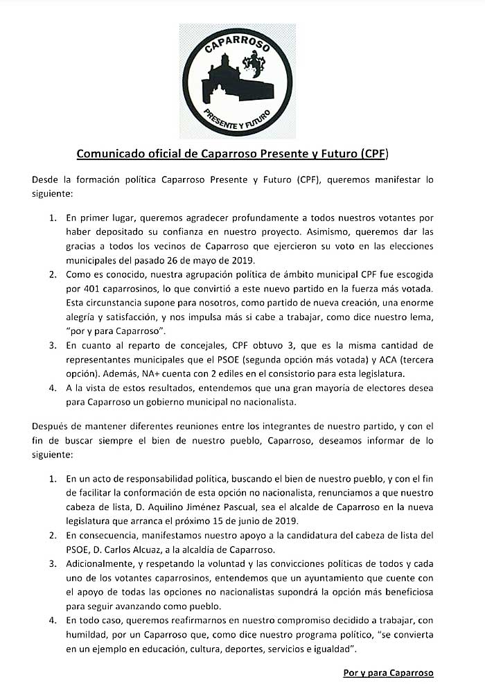 Se da la circunstancia de que Carlos Alcuaz ha logrado el pacto de gobernabilidad con el actual alcalde de Caparroso, Aquilino Jiménez, quien en 2015 se presentó por el PP y en la actualidad es el líder de CPF.