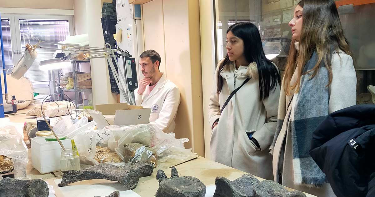 Seguidamente, Luis Arlegui, Coordinador del Grado de Geología de la Facultad de Ciencias, les enseñó el edificio en el que se cursa esta titulación. El alumnado pudo visitar el laboratorio de Paleontología, donde en ese momento se estaban estudiando fósiles de dinosaurios y mamíferos, asimismo, se realizaban estudios de anatomía comparada para hacer recreaciones de animales que vivieron hace miles de años, por lo que la visita resultó muy atractiva y práctica.