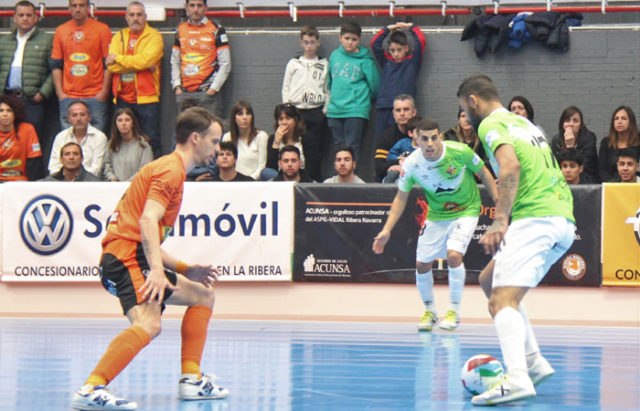 Un momento del intenso partido entre el Ribera Navarra y el Palma Futsal