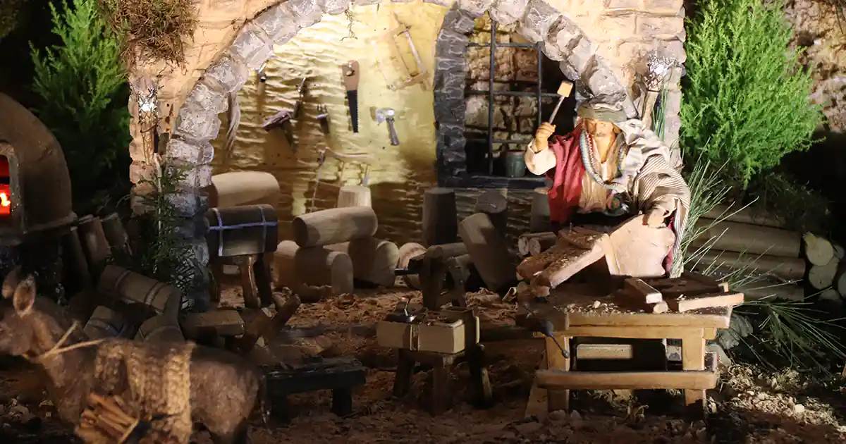 Las figuras que se conservan del Belén original son precisamente las del nacimiento, la Virgen, San José y el niño, junto con los Reyes Magos y alguna figura suelta de gran tamaño, como el leñador y la yunta de bueyes. Recuperar esta escena fue el primer paso de un grupo inquieto, que se entusiasmó con el proyecto, y que comenzó a realizar cursos de belenismo para hacer casas y que el Belén siguiera creciendo, recuerda Ucar.