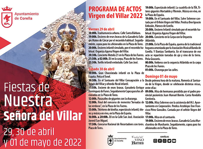 Pilar Pérez y Javier Extremado, concejala de Cultura y concejal de Festejos respectivamente, han trabajado mano a mano para confeccionar un programa que comienza el viernes 29 de abril con el concierto de Motxila 21 como acto más destacado y que terminará el domingo con la tradicional romería en el entorno de la basílica donde se repetirán las escenas de almuerzos y comidas en torno a las brasas y calderillos. «Tampoco van a faltar los encierros el viernes, el sábado y el domingo», destaca Pilar Pérez, «y las dos fiestas con Dj para los más jóvenes el viernes y sábado. Hay muchas ganas como nos podemos imaginar después de dos años».
