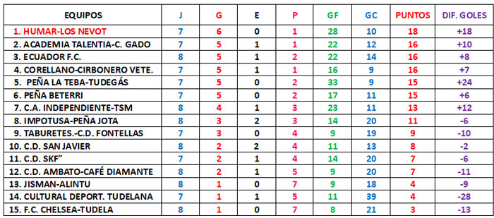 Las goleadas de la mañana corrieron a cargo de Peña La Teba-Tudegás, que le endosó un 5-1 a C.D. Ambato-Café Diamante con «hat trick» de José David Mugueta. Y de C.A. Independiente-TSM, que goleó sin miramientos a Impotusa-Peña La Jota por 7 goles a 1. Jonathan Chiluisa marcó 3 goles en este partido.