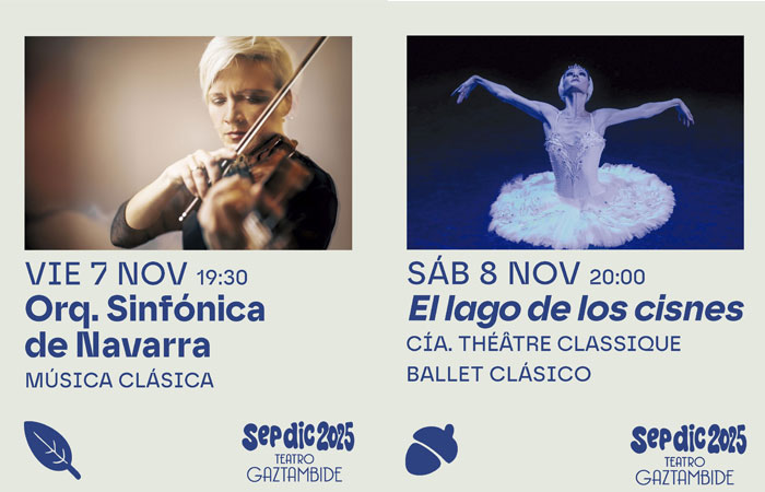 Este viernes 7 de noviembre, a las 19:30 horas en el teatro Gaztambide de Tudela, la Orquesta Sinfónica de Navarra (OSN) interpretará su programa titulado “Desde el abismo” y el sábado 8 de noviembre, a las 20:00 h., la Compañía Théatre Classique representa “El lago de los cisnes”, considerada la obra maestra más espectacular del repertorio de danza clásica.