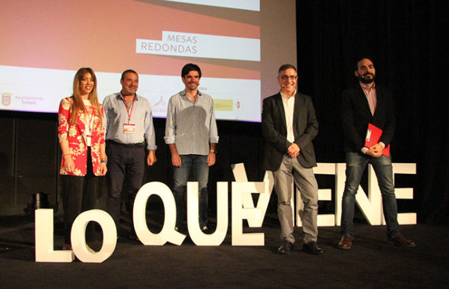 El alcalde de Tudela, Eneko Larrarte, el director del Certamen, David Martos,  el jefe del gabinete de desarrollo económico del Gobierno de Navarra, Peio Aierdi, la directora de marketing del Grupo Enhol, Natalia Oliver, y el presidente de la Comunidad de Bardenas, José Mª Agramonte, han sido los encargados de levantar el telón del certamen Lo que viene, congreso que reúne en la capital ribera a los periodistas de cine y televisión con algunas de las principales productoras audiovisuales que anticiparán durante todo este fin de semana algunos de las producciones que se verán en el cine y en la pequeña pantalla durante el segundo semestre del año y principios de 2019.