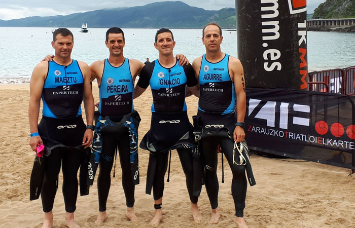 El sábado, los más valientes y fuertes del equipo, Víctor Aguirre, Álvaro Pereira, Iñaki Maeztu e Ignacio Díaz, participaron en el Triatlón Media Distancia Iron Man de Zarautz. Una durísima prueba con casi 3 km de natación en aguas abiertas desde Getaria a Zarautz, 81 Km de bicicleta con la espectacular subida el muro de Aia y 20 km de carrera a pie en un recorrido a tres vueltas por las playas y zona centro de Zarautz inolvidable por el ambiente y el ánimo del público. La dureza de la prueba se incrementó por una intensa lluvia durante todo el circuito de bicicleta que propició numerosas caídas. Destacar a Iñaki Maeztu y Álvaro Pereira que finalizaron en las posiciones 31 y 64 respectivamente, séptimo y décimo noveno en la categoría de veteranos 1.