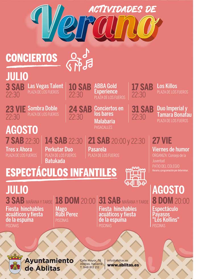 Hemos elaborado un programa con variedad de espectáculos, ya que se ha intentado pensar en todas las edades, desde actividades infantiles para los más pequeños hasta gran variedad de conciertos: musical de Abba, concierto de flamenco, música indie para gente más joven, la orquesta Pasarela para todas las edades, concierto de música de los años 80…