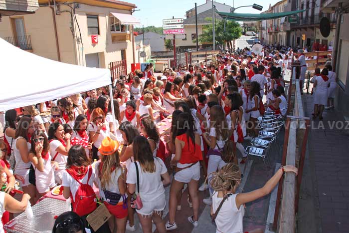 Tras la finalización del encierro del medio día las participantes en el día de la mujer se dieron cita en el patio escolar para dar comienzo a los actos programados en su día que comenzaban con el lanzamiento, desde el balcón de la casa consistorial del cohete anunciador a cargo de la reina y damas de honor de la juventud 2017, Paula Antón, Silvia Sancho y Julia Escalada que fueron elegidas representantes de la Juventud y proclamadas como tales, en las pasadas fiestas de la Juventud de julio.