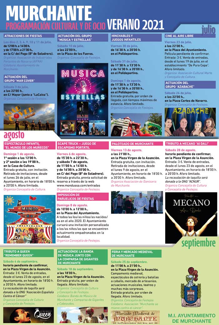 “Antes de este programa festivo, y a lo largo de la primavera, el Ayuntamiento de Murchante ha colaborado con asociaciones para llevar a cabo numerosos eventos (ciclo de cortos internacional CICOM, obras de teatro, proyección de películas de cine con coloquios en el ámbito de la igualdad, otras tres obras de teatro protagonizadas por los alumnos de los grupos de teatro locales, celebraciones de fin de curso de las escuelas municipales de rítmica y patinaje, celebración V edición del Vérsame, celebración de un rally de tierra, concierto banda XX aniversario etc), y esta es la línea que se pretende seguir desde el consistorio, la de ayudar, en la medida de lo posible, a revitalizar la vida socio/cultural/educativa y recreativa de Murchante”.