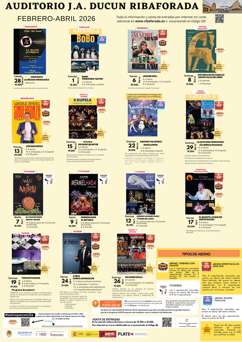 El Auditorio Juan Antonio Ducún de Ribaforada volverá a llenarse de vida en los próximos meses con una temporada cultural que reunirá teatro, humor, música, danza y propuestas familiares. El Ayuntamiento ha presentado una temporada compuesta por 15 espectáculos y dotada con un presupuesto de 51.000 euros, dentro de la inversión anual en la Casa de Cultura que ronda los 120.000 euros.