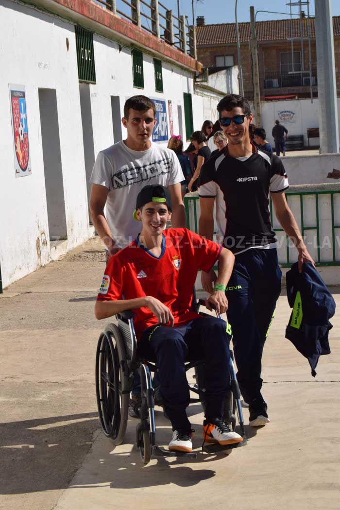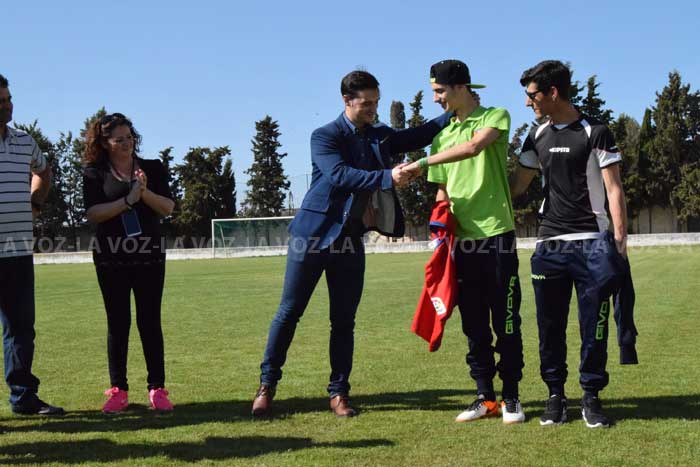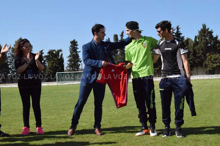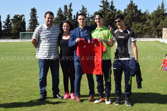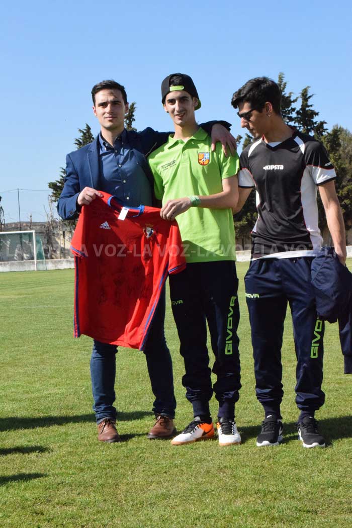 Román Alonso, delantero del Cabanillas juvenil, ya luce orgulloso la camiseta firmada por los jugadores de la primera plantilla del Club Atlético Osasuna, que le ha entregado esta tarde Aitor Royo, director de prensa del club rojillo. El acto ha tenido lugar esta tarde en el campo de fútbol San Roque de esta localidad ribera y el jugador ha estado acompañado de sus compañeros de equipo, familia, amigos y vecinos.