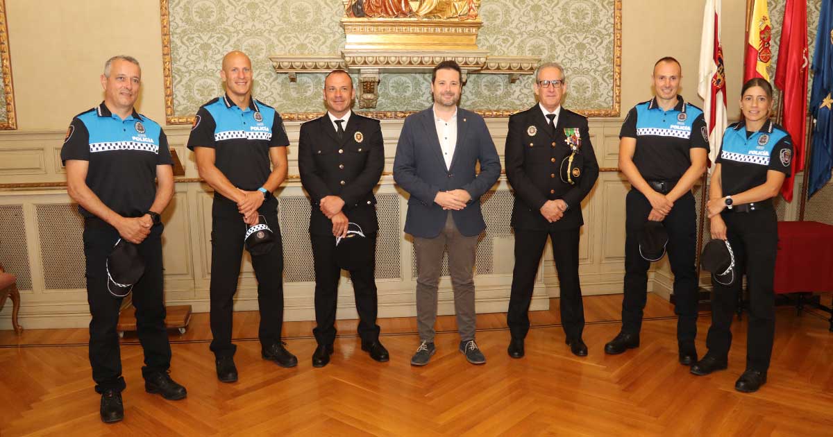 José Blas Jiménez Casamián, policía municipal que hasta ahora desempeñaba sus funciones en la localidad de Cascante, Fernando Delgado García, Gustavo Gil Pérez-Nievas y Sara Acarreta Moneo, han recibido de manos del alcalde de Tudela, Alejandro Toquero, las placas de agente municipal por las que se incorporan a la Policía Local de Tudela.