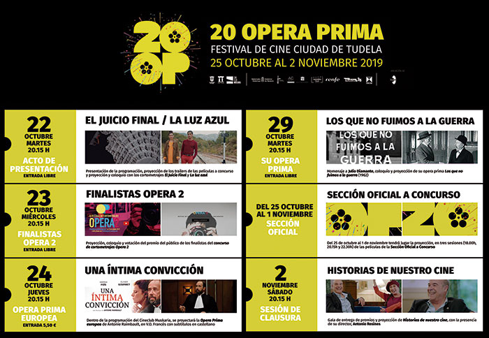 Tudela levantará el telón de la vigésima edición del festival de cine «Opera Prima» el próximo 25 de octubre con un cartel al que dan forma «Abuelos», «Ventajas de viajar en tren», «Ojos negros», «La filla dàlgú», «La muerte solo es el principio», «7 razones para huir» y «La hija de un ladrón», que competirán hasta el 2 de noviembre por llevarse el favor del público encargado de otorgar el premio a la mejor película.