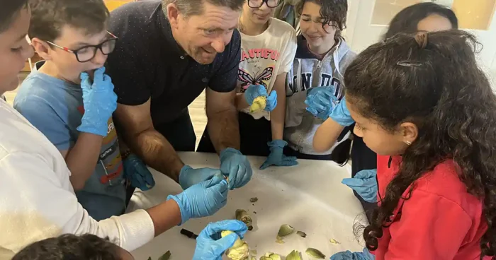 “Os he traído distintos tipos de espárrago, de diferentes calidades, para que podáis diferenciar entre lo que es un espárrago de primera y lo que no”, les decía. Un taller del que los alumnos y las alumnas disfrutaron mucho y les situó en buena predisposición para afrontar el último reto: el pelado de alcachofas.