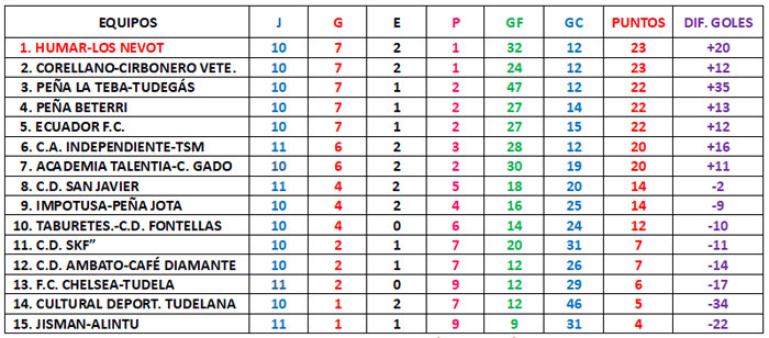 La goleada de la mañana dominical vino de la mano de Peña La Teba-Tudegás que le endosó un 0-7 a Jisman-Alintu con «póker» de goles de José David Mugueta, el «pichichi» del Campeonato con 15 goles en 10 partidos.