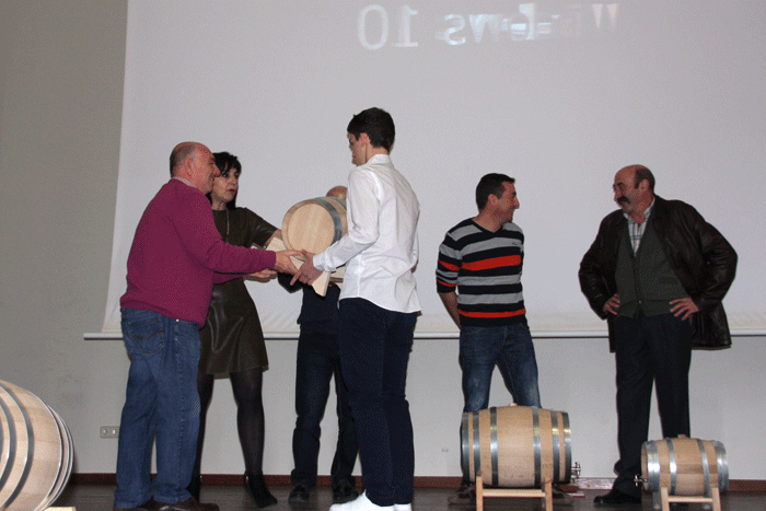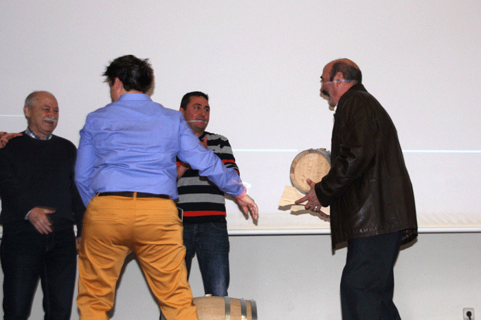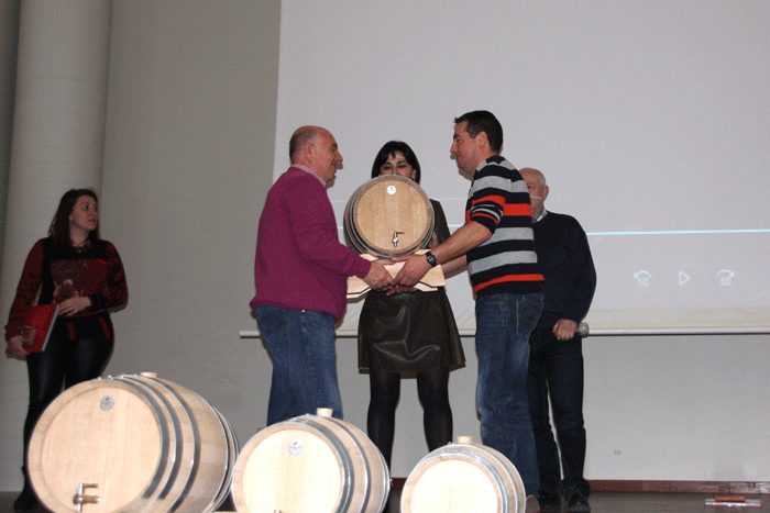 Durante el aperitivo popular con todos los vinos presentados que pudieron ser degustados se hicieron públicos los tres ganadores de vino tinto a los que se les entregó tres toneles de diferente tamaño, según su posición. También este año se concedió un primer premio al mejor rosado consistente también en un tonel, y se. Los premios de tinto recayeron en el número 20 que correspondía a Nekane Pérez Pardo, como ganadora, el segundo premio correspondió al número 21 de Julen Pejenaute Pérez, y tercero fue para el número 19 de José Antonio Zapata Sarabia. El primer premio de rosado fue para Alfredo Pejenaute Barrado.