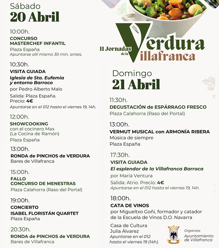Empezamos con un Masterchef para los niños, tenemos un Showcooking, ruta de pinchos de verdura por los bares, un concurso de menestras, degustación de espárrago fresco, ahora que estamos en temporada y finalizamos con una Cata de vinos, de la tierra, por supuesto